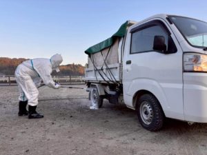 弊社は、ウイルス拡散防止策として農場や関係建物に出入りする車両の消毒をおこないました。