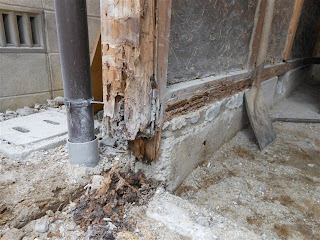 この箇所は前写真の左隅の柱です。かなりひどく食害されています。