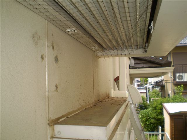 アブラコウモリ たくさんの糞が落ちている。 壁にも糞がついている。 「アブラコウモリ」です。 住宅地で見かけるコウモリはこの種類です。 わずか1センチの隙間で進入します。 コウモリは鳥獣保護法によって守られていますので許可なく採ったり駆除したりはできません。 かわいそうですが、違うお家を探してもらうしかありません。 忌避剤投与の後に侵入予想箇所をふさぎました。