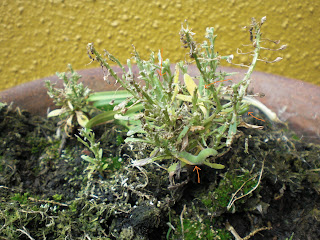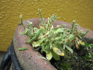 またまた・・・ 見つけてしまいました(●`з´●) わかりますか? オレンジの線で囲ってみました。 緑色の・・・ 前回見つけたのとは種類が違いますが・・ このアングル・・・ ぎゃ~~~~~っ!!! わんさかいますよ(TT) 枯れ果てて不毛地帯のような 鉢植えでしたが、わずかに生き延びた 植物にたかるなんて。 恐るべし虫・虫!! あまりに悲惨な鉢。 早く植え替えせねば(^-^;)