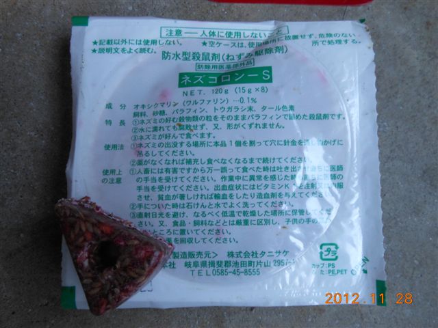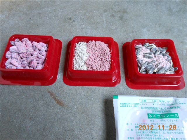 ベイト薬剤を用意します。喫食させる殺鼠剤です。どれを好んでたべるのか?数種類で試します。