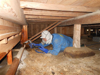 下地清掃と補修後に、ガラスマットを樹脂で積層していきます。